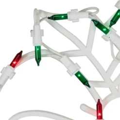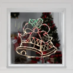 Add a touch of holiday magic to your home with our lighted bells holiday window silhouette. This enchanting window display features beautiful bells adorned with a festive bow, all illuminated with a warm and inviting glow. Whether you place it in your living room, bedroom, or front window, this charming decoration is sure to spread holiday cheer and create a cozy atmosphere for your celebrations. Product Features:Color: red, green and white bulbs / white wireNumber of bulbs: 50Bulb size: mini24″ white lead cordDouble-sided designFully assembled:suction cup included Additional Product Features:Super bright bulbsUL certified and approved for indoor or outdoor useIf one bulb burns out, the rest will stay litComes with replacement bulbs and spare fuseContains 1 plug with end connector which allows you to stack multiple lighted items together (not to exceed 210 watts)Wire gauge: 22120 volts, 60 hertz, .17 amps, 20.4 wattsDimensions: 14.25″H x 15″W x .75″DMaterial(s): plastic/wire/glass bulbs