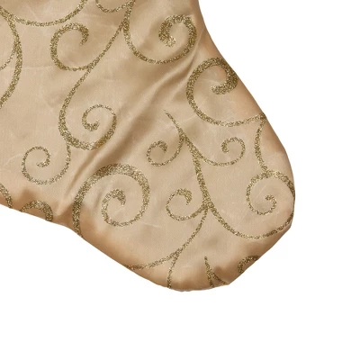 This stunning holiday stocking will make a style statement with its eye-pleasing appearance! Showcasing a satin-like base with glittered swirls, this stocking includes a gold cuff. Now you can easily stow all the gifts of Santa Claus!Product Features:Golden holiday stockingSatin-like gold base with glittered gold swirls Gold velveteen cuff and backing with metallic gold pipingOne-sided designComes ready-to-hang on a 3″ gold loopFor indoor use onlyDimensions: 20.5″ high x 10″ wideMaterial(s): polyester