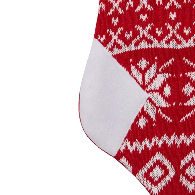 Celebrate a country holiday with family and friends this year. This stocking is red and white has different knitted patterns, with a white cuff, heel, and toes. From the Country Tweed collection, this stocking is perfect for adding an extra touch of cozy your rustic holiday decor. Product Features:Red and white holiday stockingFeatures knitted line, heart, diamond and snowflake designsWhite fleece toe and heel accentsRed fleece backing and white fleece cuff with red pipingOne-sided designComes ready-to-hang on a 3″ red loopRecommended for indoor useDimensions: 20.5″ high x 10″ wideMaterial(s): polyester/fleece